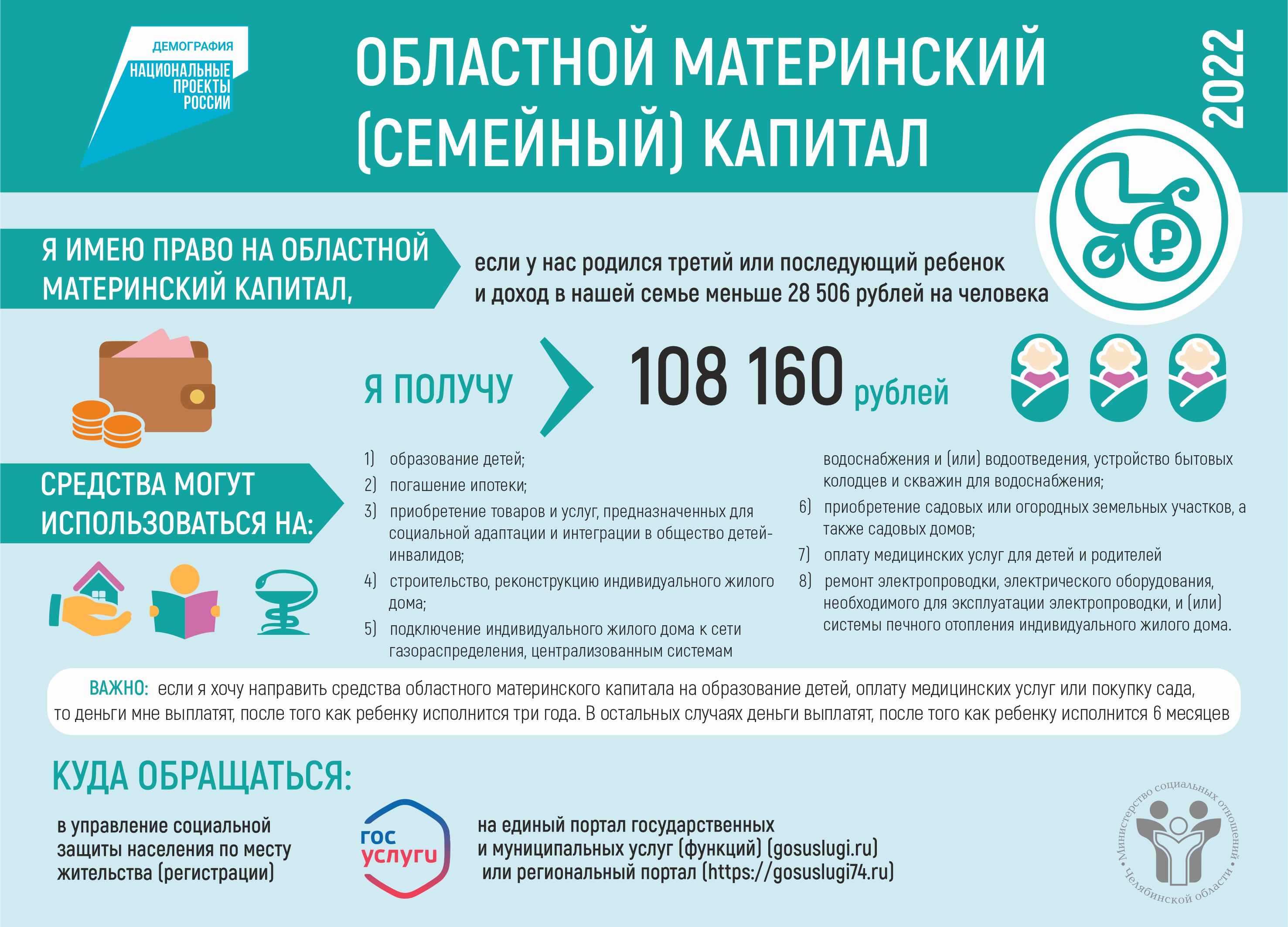 Право на областной материнский (семейный) капитал имеют семьи, в которых родился третий или последующий ребенок и среднедушевой доход ниже 28 506 рублей (с 1 июня 2022 года). Оформить заявление на областной маткапитал, размер которого 108 160 рублей, можно в управлении социальной защиты, едином портале государственных и муниципальных услуг: https://www.gosuslugi.ru/600234/1/form. Этим правом семья может воспользоваться однократно.