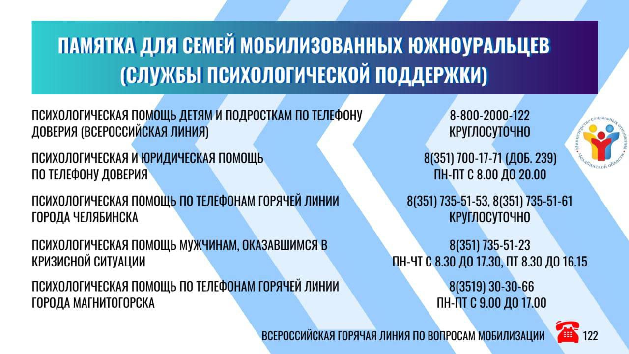 В целях информирования граждан о мерах социальной поддержки в министерстве социальных отношений Челябинской области запущена горячая линия 8-912-806-84-96. Также на базе учреждений соцзащиты развернуты службы психологического консультирования. Обратиться за поддержкой могут как дети, так и взрослые. «Высококвалифицированные психологи помогают родственникам мобилизованных справляться с чувством тревоги, а также снизить уровень стресса, разобраться в ситуации, – рассказала Ирина Буторина. – Министерством запланированы мероприятия-интенсивы, направленные на повышение профессиональных компетенций психологов, работающих с населением».