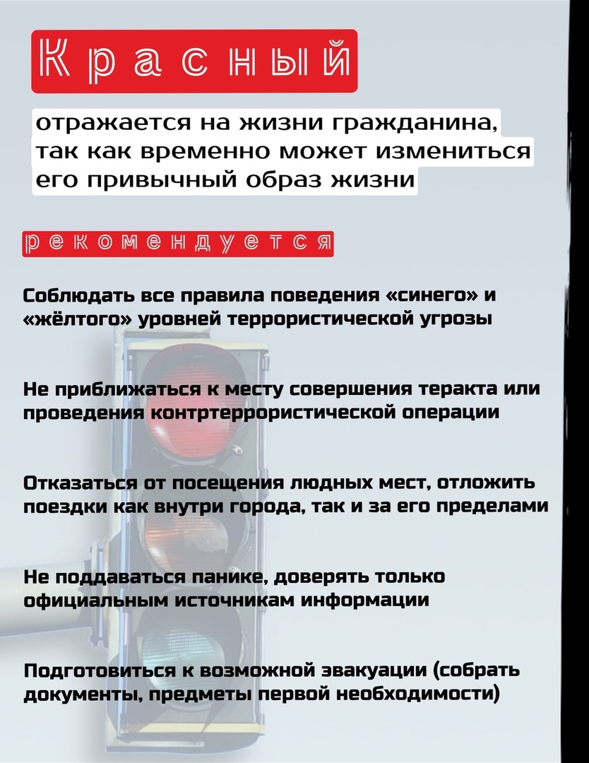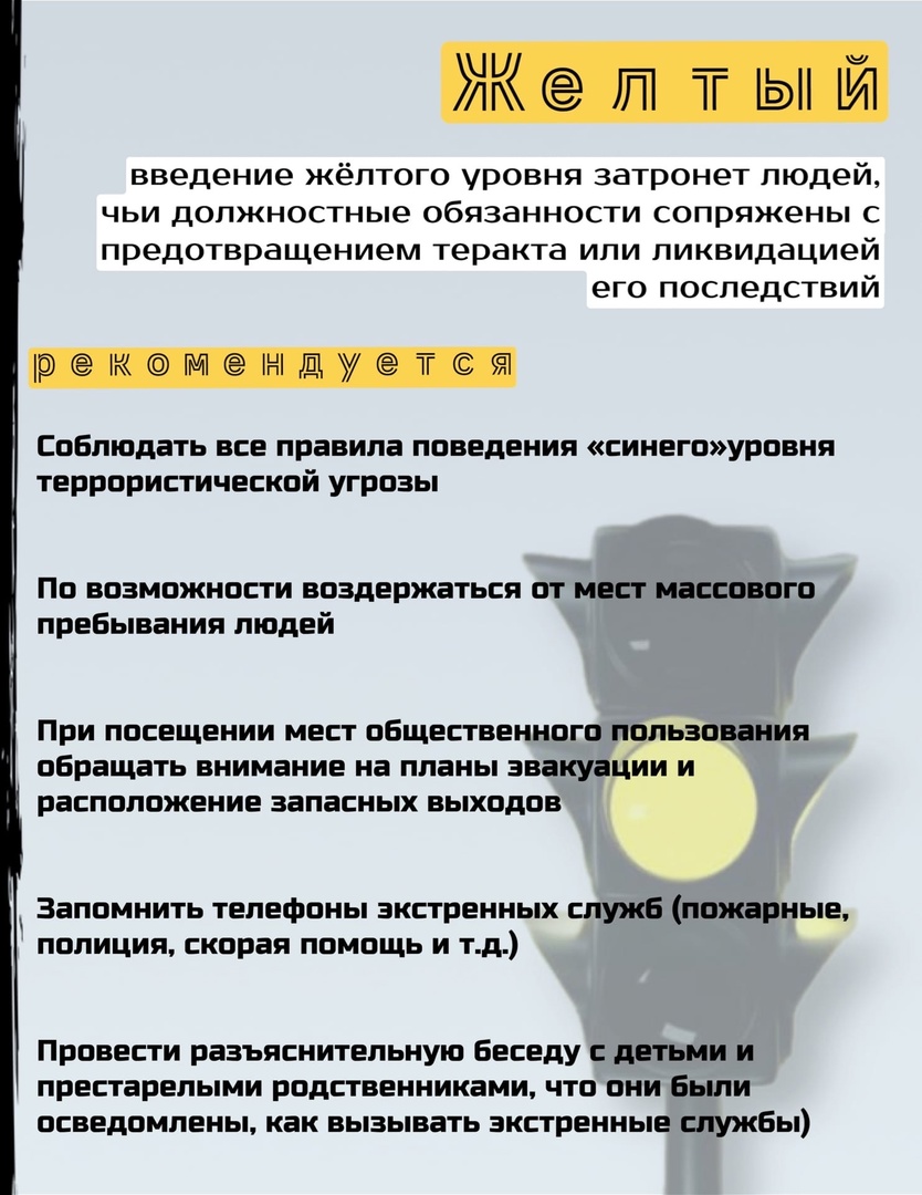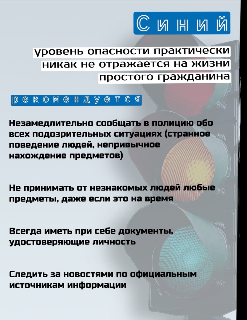 Что нужно знать об уровнях террористической опасности?Разбираем «светофор» террористической опасности. Тот или иной уровень устанавливается, чтобы своевременно информировать население об угрозе теракта и противодействовать его совершению.