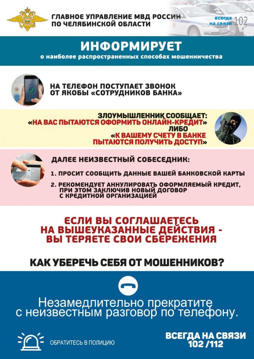 В связи с участившимися случаями мошенничества с использованием банковских карт и мобильных телефонов предлагаем ознакомиться с информационными материалами, разработанными Главным Управлением Министерства внутренних дел России по Челябинской области.