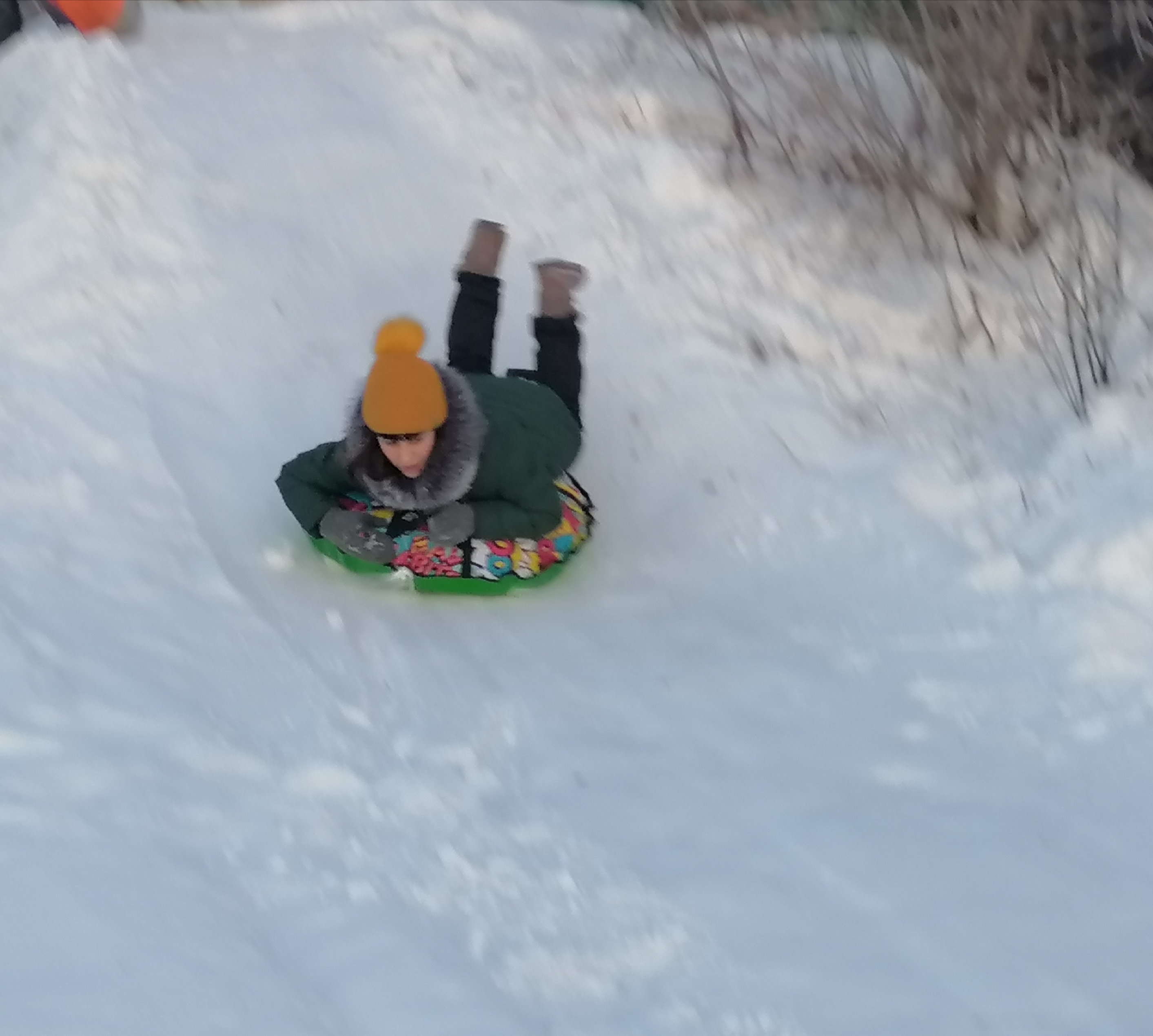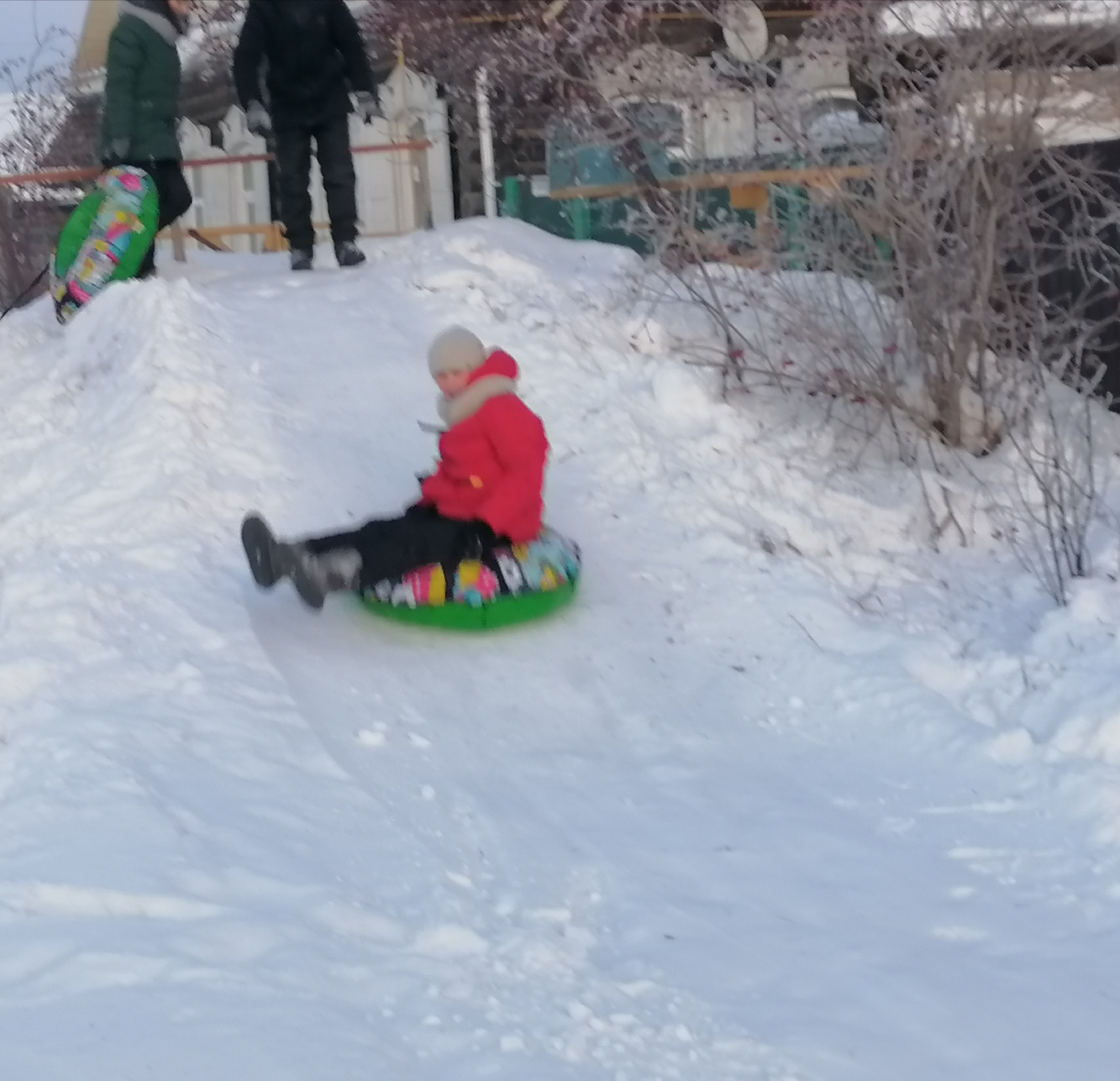Группа воспитанников катались на тюбингах различных размеров и остались очень довольны скоростью, которую развивает снежный «болид».