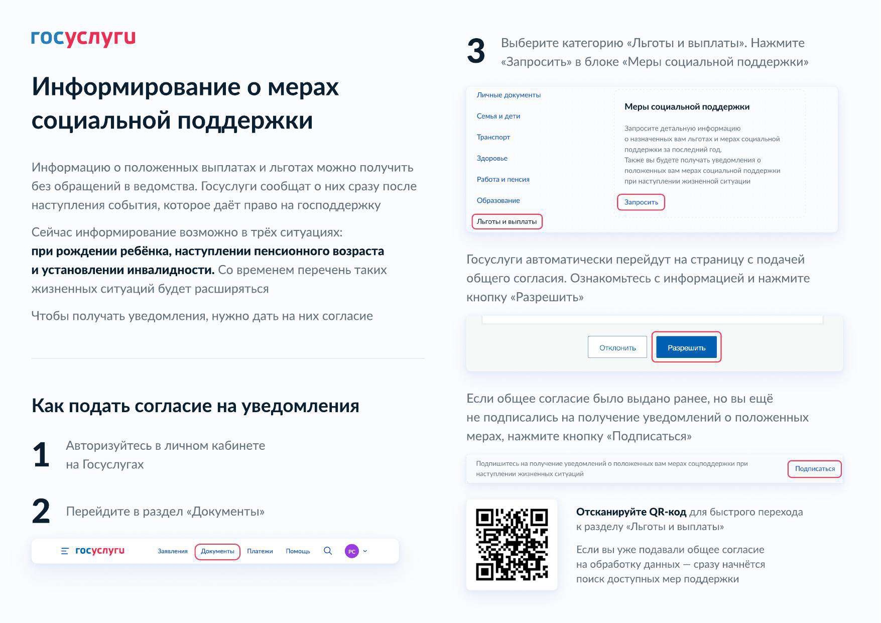 Проактивное информирование предполагает, что гражданин получает информацию о полагающихся ему мерах поддержки при наступлении определенных жизненных ситуаций. Для того чтобы получать проактивные уведомления, необходимо заполнить согласие в личном кабинете на едином портале госуслуг в разделе «Документы», категория «Льготы и выплаты».