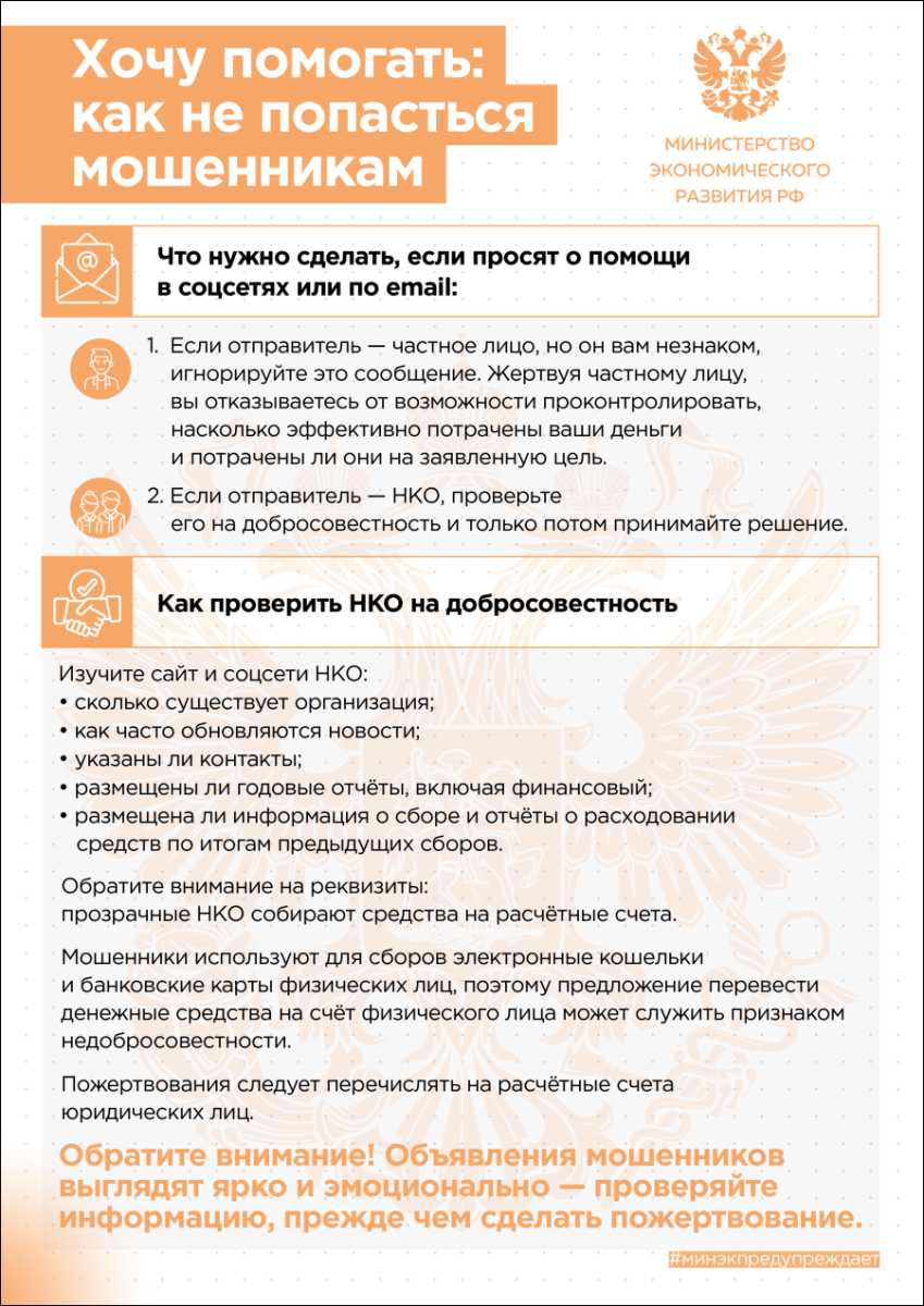 Министерством экономического развития Российской Федерации подготовлены материалы для граждан, направленные на борьбу с мошенничеством при сборе частных пожертвований.