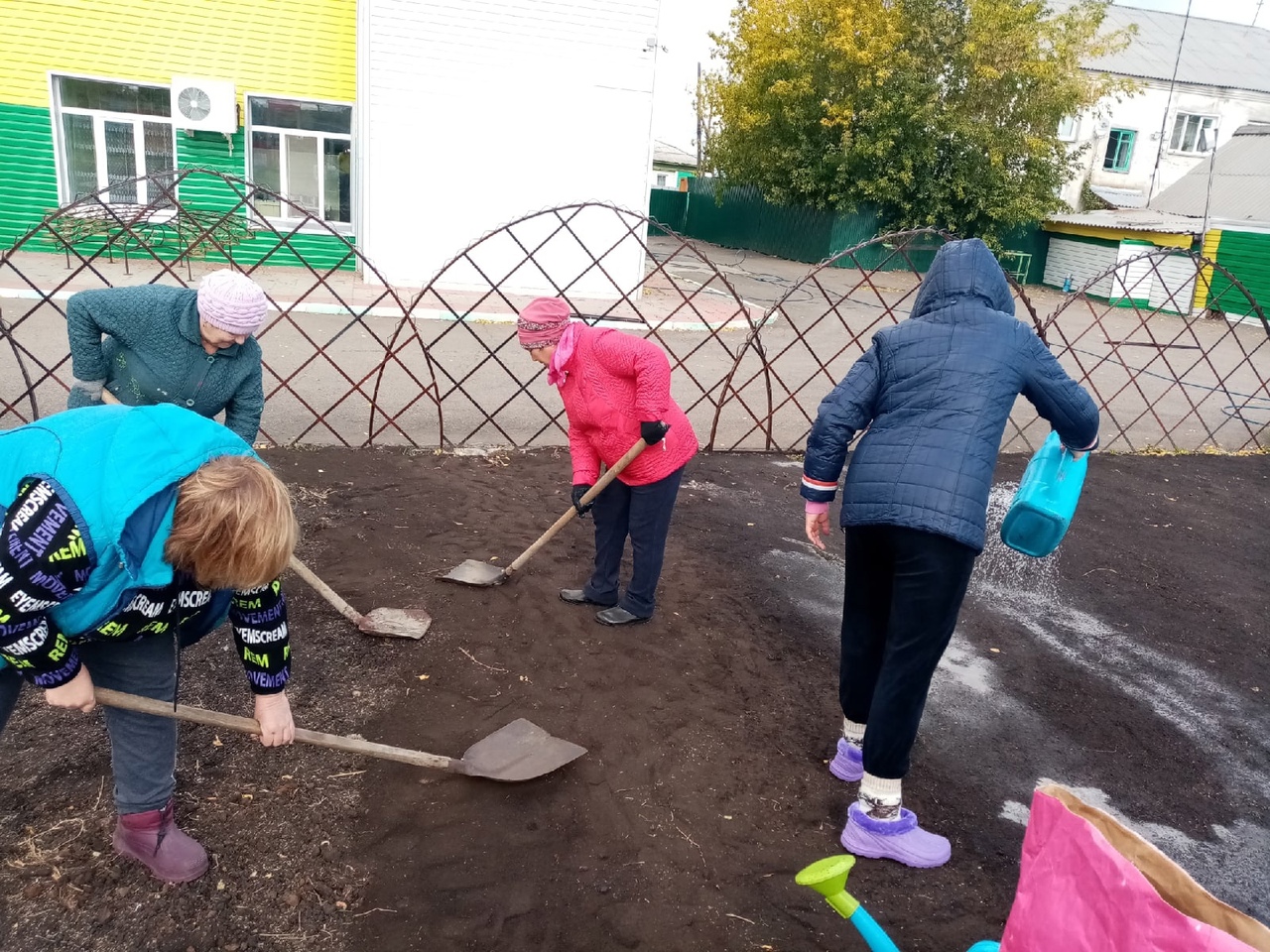 Сейчас в проекте небольшое изменение в облике детской и спортивной площадок. Убраны кустарники, а на их территории будет газон. Сам процесс посадки газонной травы трудоёмок и непрост. Семена необходимо покрывать слоем просеянной земли и сразу поливать водой. Всем коллективом, дружно и весело занимались этим процессом. Теперь ждём всходов, а на следующий год будем ухаживать за свежим газоном.