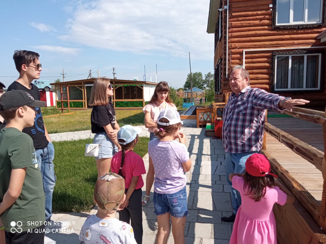 Ребят ждала познавательная экскурсия по территории с уникальными постройками из дерева, сделанными с любовью своими руками. Это просто шедевр!