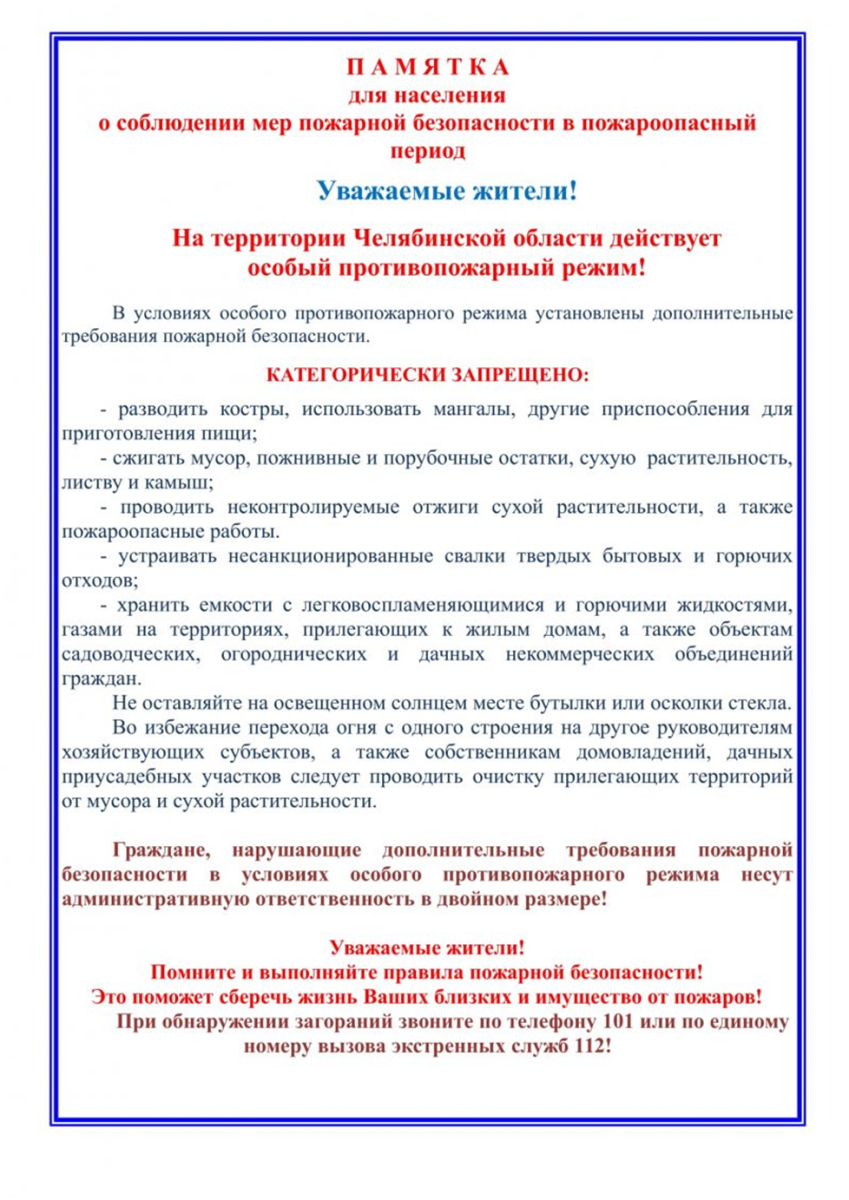 В связи с установлением положительных температур воздуха, сходом снежного покрова и повышением пожарной опасности в лесах постановлением Правительства Челябинской области от 05.04.2021г №125-П «Об установлении начала пожароопасного сезона в лесах на территории Челябинской области в 2021 году « с 10 апреля 2021года объявлено о начале пожароопасного сезона. В связи с этим просим граждан соблюдать правила пожарной безопасности.