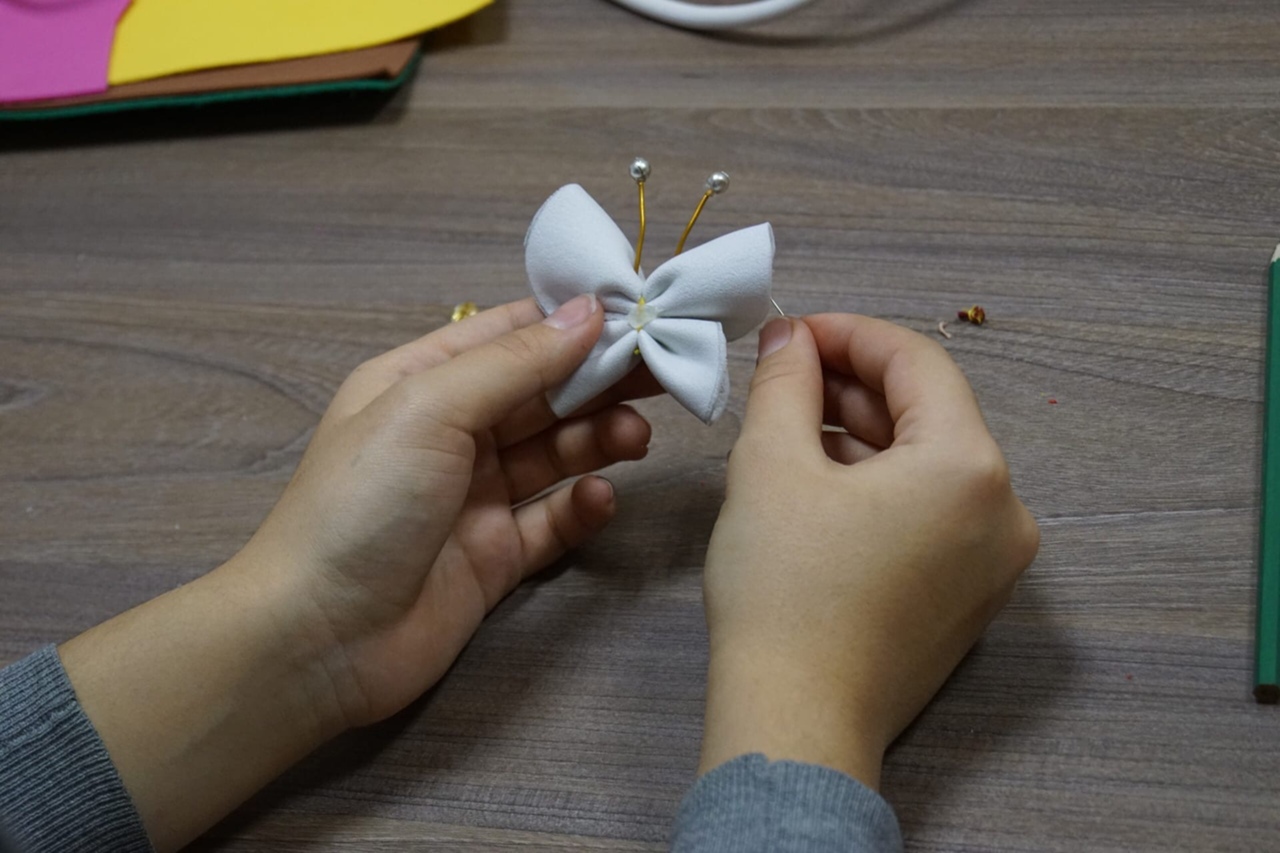 Ребята с радостью приняли участие в овладении необычном навыком, с интересом слушая объяснения Жанны Петровны, подбирали яркие цвета. Творческое занятие прошло в атмосфере дружеского участия, каждый ребенок сделал свою собственную неповторимую бабочку. Специалисты подходили на помощь, когда у кого- то возникали проблемы с реализацией идеи. В конце занятия дети, подходили друг к другу и демонстрировали свои поделки.
