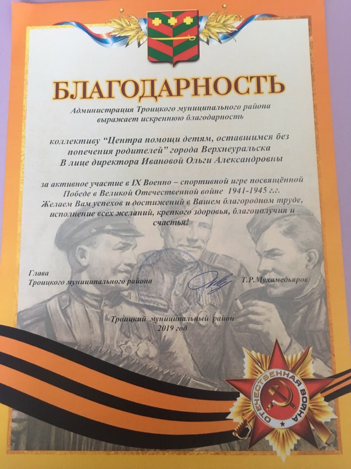 Второй день был волнительным, были озвучены результаты игры. И команда Верхнеуральского центра помощи детям под руководством Кайгородовой Натальи Владимировны и Мифтахова Радика Альбертовича стала победителем девятых Военно-спортивных игр, посвященных Великой Отечественной войны. Победа была безоговорочной , первыми мы были во всех номинациях. Кубки победителей, множественные грамоты, подарки! Мы - Победители-2019! Мы лучшие !